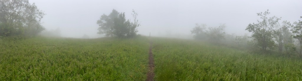 The fog on trail this afternoon was so thick that I almost couldn’t see the trail sometimes. It was so heavy that at one point at the top of a mountain, I got turned around, and ended up following the same trail back down for a half mile as I’d followed up. It took that long before I realized that I was accidentally back tracking. So up the hill, back down, then back up, then onto the RIGHT trail, and back down again. That one was frustrating.