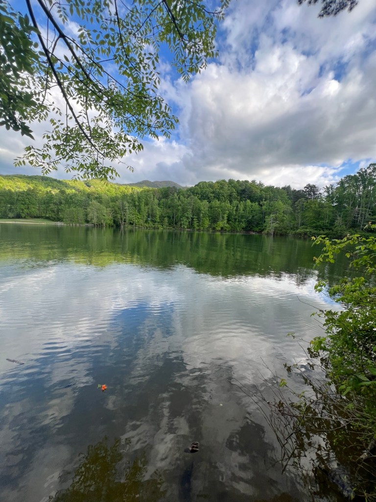 It wasn’t far–maybe 75 yards, when we got to an intersection. The trail split and led down to the lake or followed the AT, but I could see he was about to head down to the lake to fish. I asked if I could join him, since I was going to have dinner around there soon. He said yes, and so we continued on.