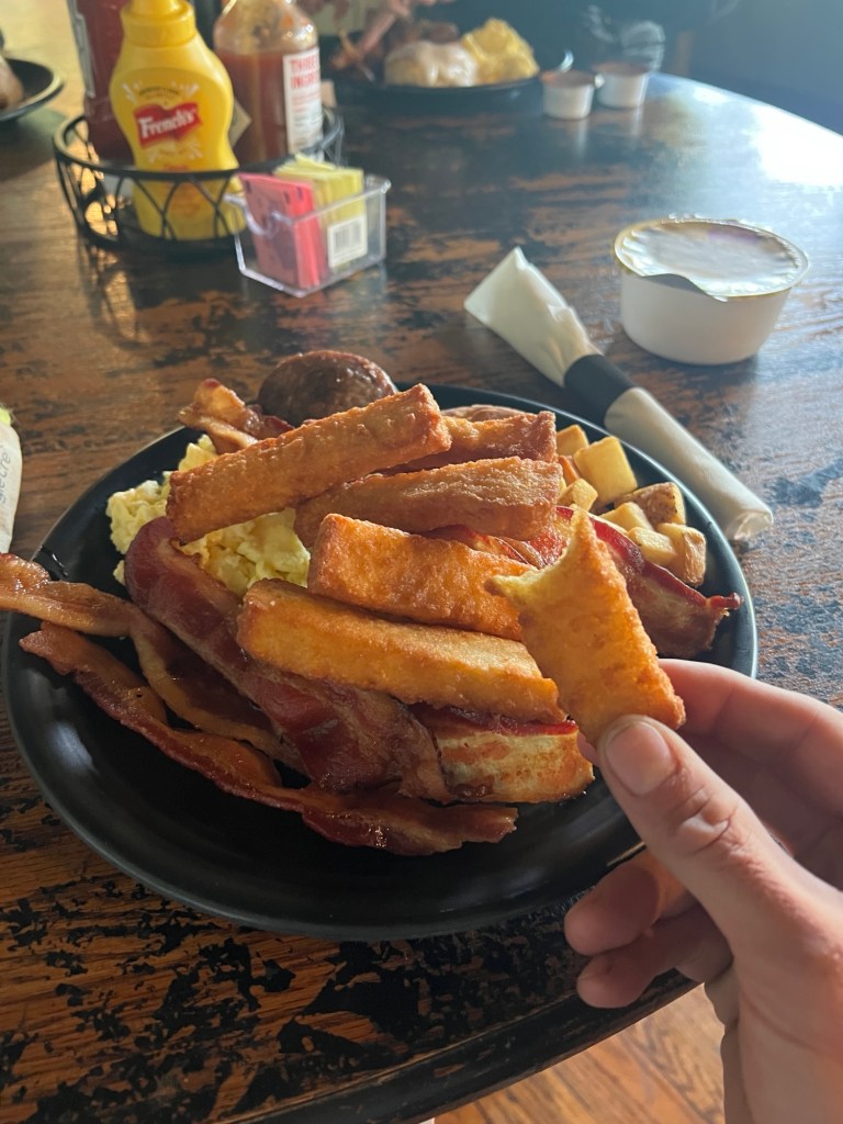 Oh–so the plan WAS to go back to trail after food resupply, but right away when I got to town and opened my phone, Specs had texted me. He’s the guy I hiked with yesterday, and we’ve gotten along better than anyone else I’ve met on trail. He told me he’d hitched in from a place around 7 miles before where I came into town, and that he was mowing down on pancakes at the pancake house (one of at least three on this one strip).