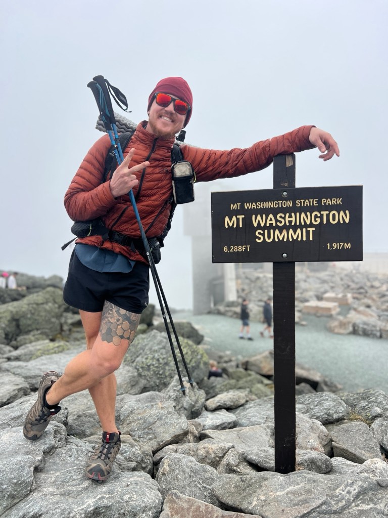 I start the journal today at the top of Mount Washington. It’s extremely smokey and overcast today, but no rain yet. There is rain for the forecast in the coming days though, so I need to be on my way soon. Have used charging electronics as an excuse, but I’ve also talked to some tourists who were enamored by my trip, so I let some time pass with them and let my battery bank charge up a bit. Now I’ve been here long enough that the pizza and soft pretzle bar opens in 15 minutes, so I think I’m going to start packing up, get lunch, and be on my way.