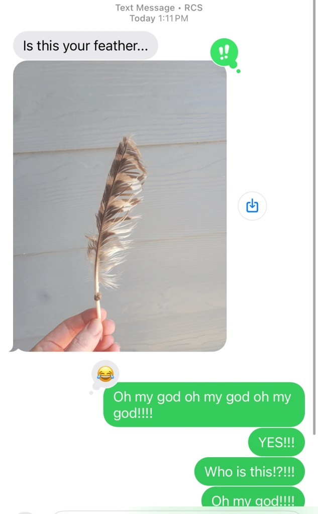 She was a southbound hiker whom I’d met the evening that I lost my feather. It was an hour after I realized I’d dropped it. Then another half hour before I met the SOBO. She was going to camp there for the night, but I introduced myself and had her take a picture of my business card. I told her the story about carrying the feather for so 62 days, and asked that if she finds it tomorrow that she reach out to me by text.